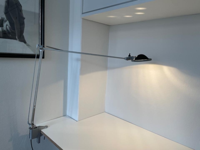 Die Lampe ist einige Jahre in Gebrauch, wurde stets pfleglich behandelt Der Zustand ist gut, technisch und optisch. Die Halterung kann sowohl (an einen Schreibtisch) geklemmt werden als auch an der Wand verschraubt werden.