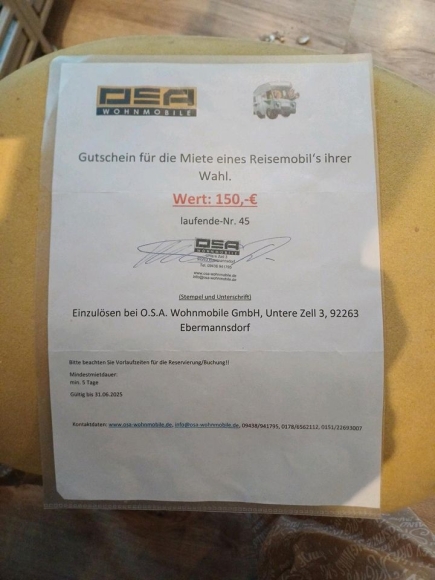 Wohnmobilgutschein über 150 € von OSA Wohnmobile für 50 € zu verkaufen