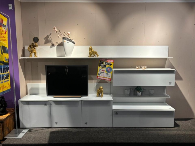 Wohnwand bestehend aus sieben Teilen, kann aufgehangen / gestellt werden nach belieben. Front sowie Ablageflächen sind mit Echtglas ausgestattet. Details wie Griffe mit Alu.