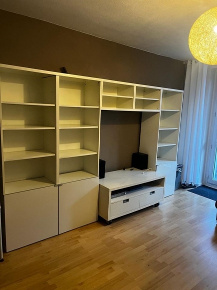 Wir verschenken unsere Wohnwand mit TV-Bank (auf Rollen) von Ikea. Es handelt sich um das alte Besta-System.