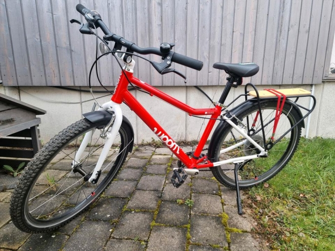Gebrauchtes Woom 5 in rot mit üblichen Gebrauchsspuren (siehe Bilder) mit Ständer, Schutzblechen und Gepäckträger. Sehr gut gepflegt, immer unter Dach geparkt, Nachrüstung (wie von woom empfohlen) bereits durchgeführt.