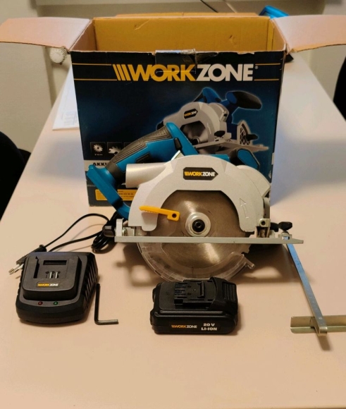 Wenig benutze und voll funktionsfähige Workzone Akku Handkreissäge mit original Verpackung, Akku, Akkuladegerät und Zubehör.