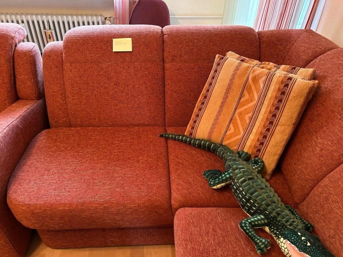 Eine rot-orange Eckgarnitur mit einem Sessel in klassischer Form aus robustem Textil. Nicht ganz neu, aber sehr gut erhalten. Die Maße stehen auf den Post-its auf den Fotos. Für Selbstabholer in Mannheim.