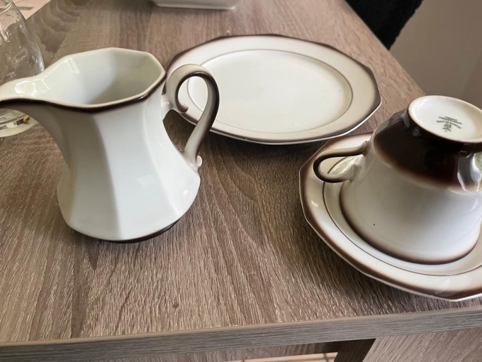 „Geschirr in sehr gutem Zustand, wird wegen Umzug verkauft. Von jeder Sorte (Tassen, Teller, Töpfe usw.) gibt es 16 Stück, zusätzlich zwei Tassen für Milch.