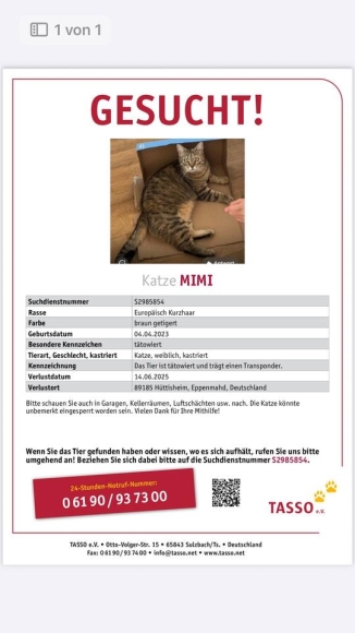 Bitte auch in Garagen, Kellern, Schuppen oder Autos nachsehen – Mimi ist sehr neugierig und könnte sich versehentlich irgendwo eingeschlossen haben!