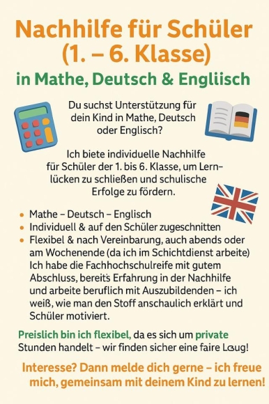 Ich biete individuelle Nachhilfe für Schüler der 1. bis 6. Klasse, um Lernlücken zu schließen und schulische Erfolge zu fördern.