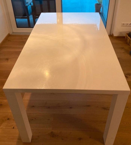 Die Tischbeine können nicht abgeschraubt werden, daher empfiehlt es sich, ihn mit einem Transporter abzuholen.