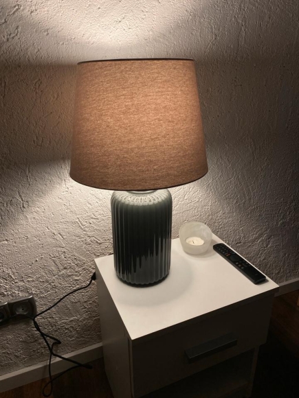 Ich biete eine wunderschöne Vintage-Tischlampe mit geriffeltem Keramikfuß in elegantem Dunkelgrün und einem klassischen Stofflampenschirm in warmem Braunton.