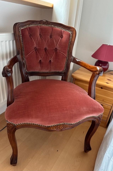 Italienischer Biedermeier-Stuhl – Nussbaum mit altrosafarbenem Samt Polster – 80 €