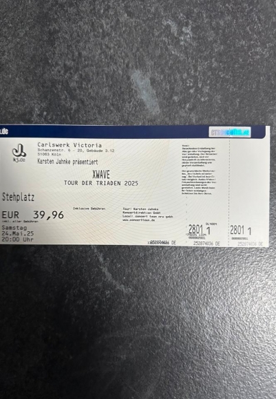 Ich verkaufe hier ein Ticket für das ausverkaufte X Wave Konzert in Köln am 24.05.2025, da ich aufgrund von zeitlichen Gründen leider nicht kann. Das Ticket wurde über Eventim erworben. Bei jeglichen weiteren Fragen gerne melden.