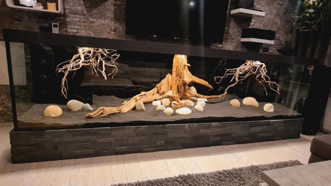Heckscheibe ist schwarz foliert ! Mit einer XXL Mangrovenwurzel in der Mitte des Beckens und diverse große XL Flusskiesel gibt es mit dazu !