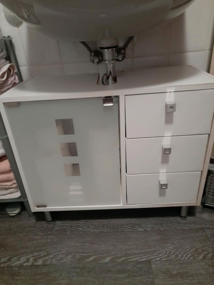 Zu verschenken: Badezimmerschrank mit Milch/Glastür und Schubladen in weiß. Und silberne Füße. Nichts kaputt auch Schubladen funktionieren einwandfrei. Tür hat Magnetverschluß.