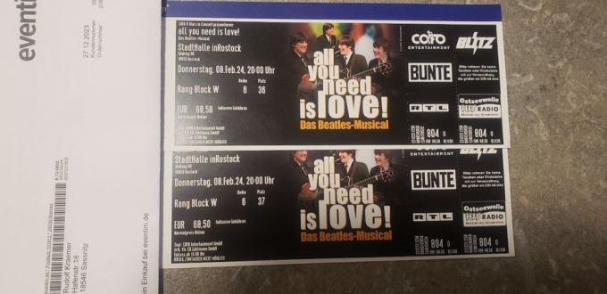Zwei Eintrittskarten Beatles Musical Rostock 8.2.24