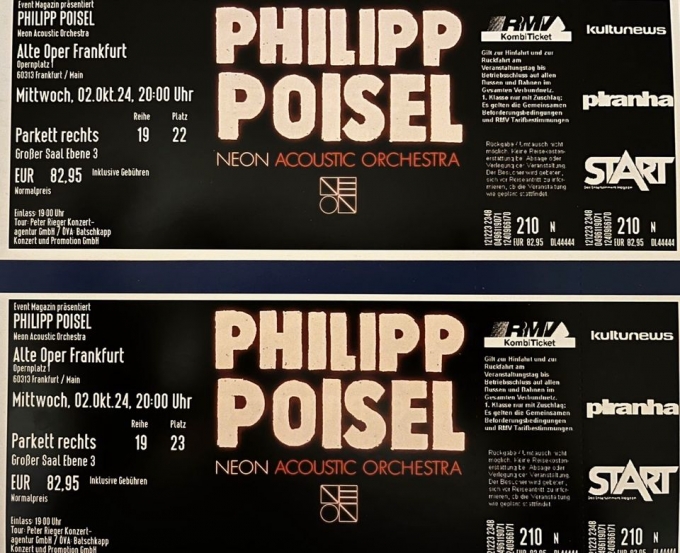 Ich verkaufe die beiden angezeigten Tickets für das am 02.10.2024 in Frankfurt stattfindende Philipp Poisel Konzert in Frankfurt.