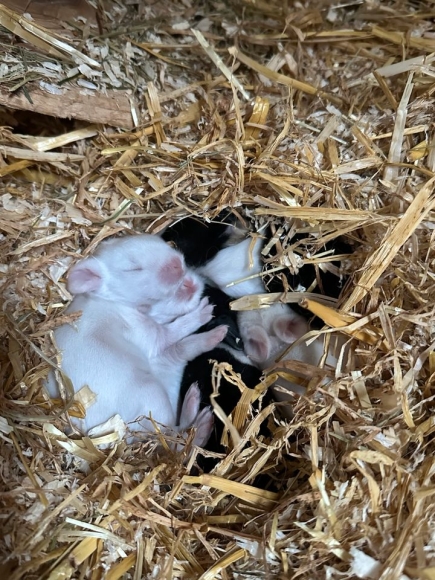 Wir sind 3 weiße Hasenkinder ( blaue Augen ) und 2 schwarz/weiße.